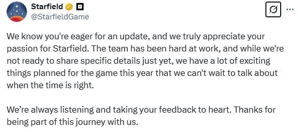 In a response to a fan on X asking about future content for the title, the official Starfield account assured them that "The team has been hard at work, and while we’re not ready to share specific details just yet, we have a lot of exciting things planned for the game this year".