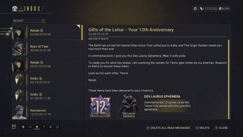 First up, all you need to do is sign in between now and Dec 31st, 2025 to receive the Dex Laurus Ephemera and 12th Anniversary Glyph for free.