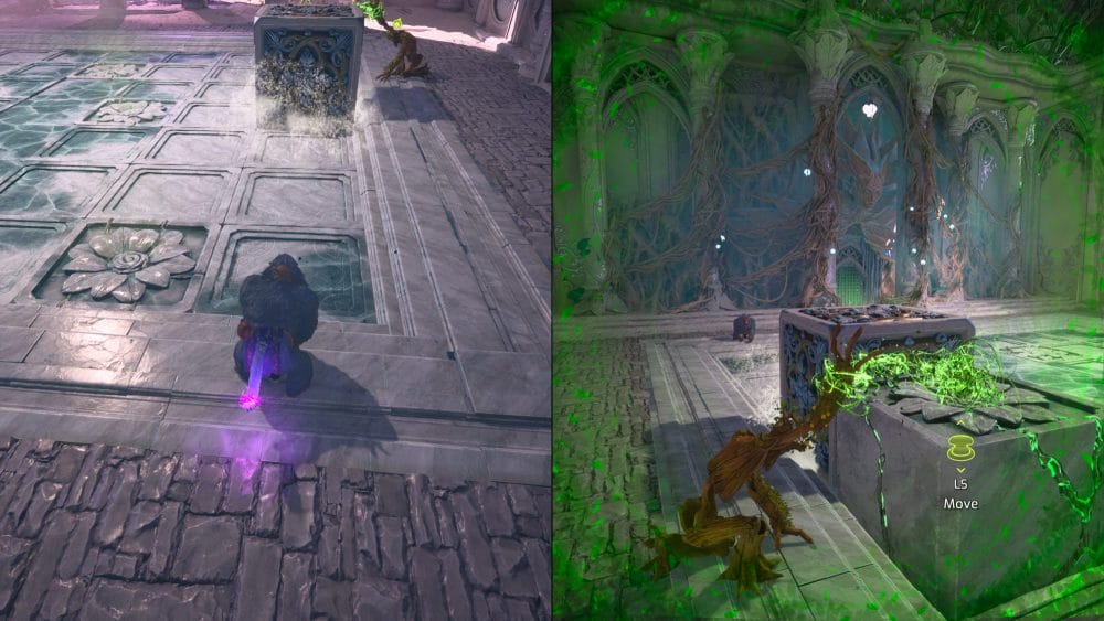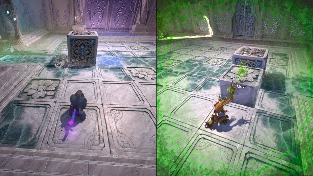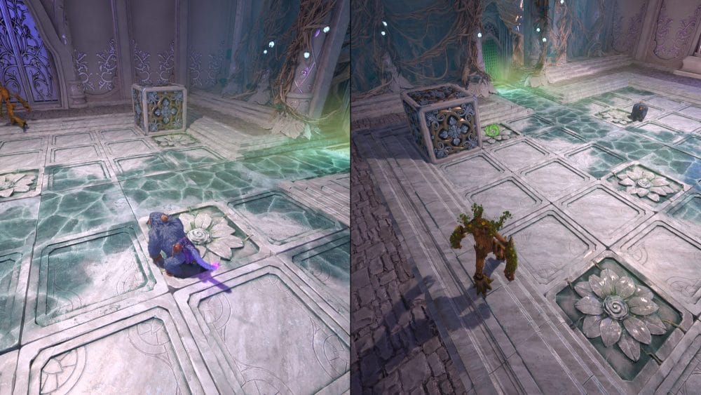 In order to navigate it you will need player one to be in gorilla form and player two to be in...tree mode? Sure let's call it tree mode. Player 1 can smash the block around the floor and player 2 can lift stones to block the sliding stone to get the right path. Keep in mind you can only lift 1 stone at a time with player 2. Here's a step by step guide.