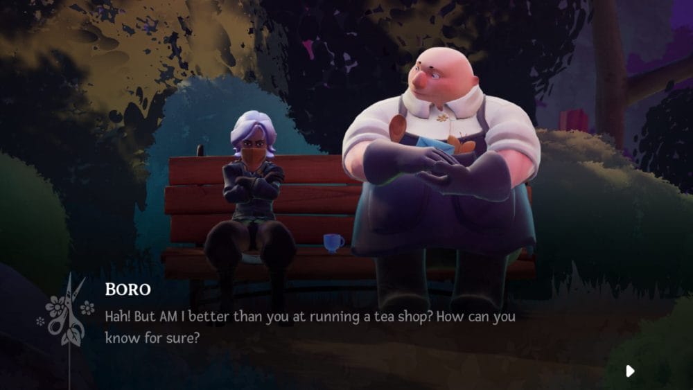 Boro is a kind and mild-mannered soul, whose caring nature and subtle wisdom is present in everything he says. He suggests to Alta that she stay and help him at the tea shop as a way to regain her strength, even though all the young woman wants to do is continue on her journey back to who she was. The game lets you leave anytime you want, but every attempt ends the same way, with Boro carrying Alta’s unconscious body back to the tea shop.
