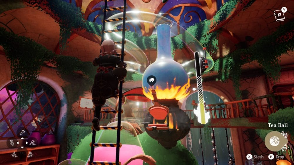 Brewing the tea is an event unto itself. On entering the Wanderstop tea shop Alta finds a giant contraption made of several interconnected glass bowls and pipes, like a colossal alchemy kit. There is a process to making the tea, and Alta must use a ladder to reach certain parts of the apparatus. I absolutely loved this element of the game, not because it was challenging or different everytime I did it, but because it was enjoyable to watch the process. Boiling the water, watching it change colour depending on the ingredients I added, to finally pouring it into a dainty cup was such a pleasurable experience. My only issue with it is that the rope you pull to pour the tea can be a bit pernickety, only giving me the option to interact with it if Alta was in the exact right spot.