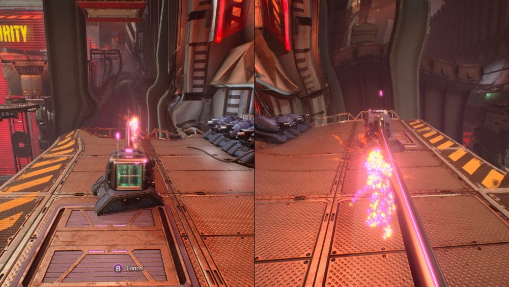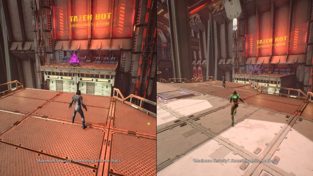 During the cell blocks section of chapter 6 you will reach an area where there is a "tazer bot" on a platform to the right of you. You will see tazer bot written on the wall above it and it is required for story progression so you can't miss it. Player 1 needs to go across and hack into it. They can then extend the arm out to help player 2 get across.