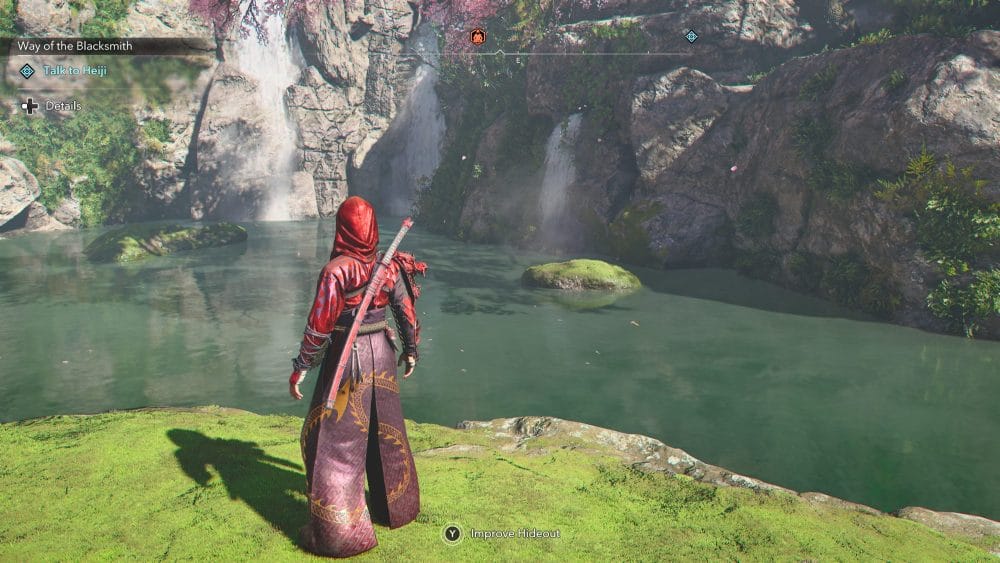 On a piece of land in the middle of the water here you will see a Kuji-kiri meditation area to help you level up your knowledge rank. For Made You Look however we want to focus on the waterfalls.