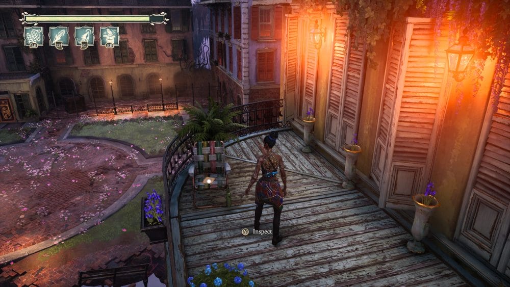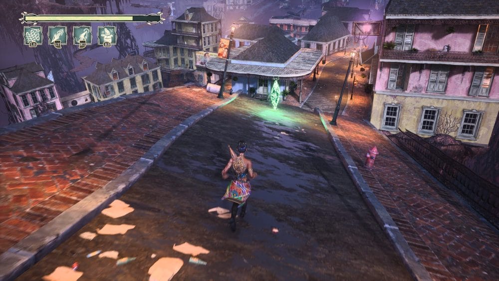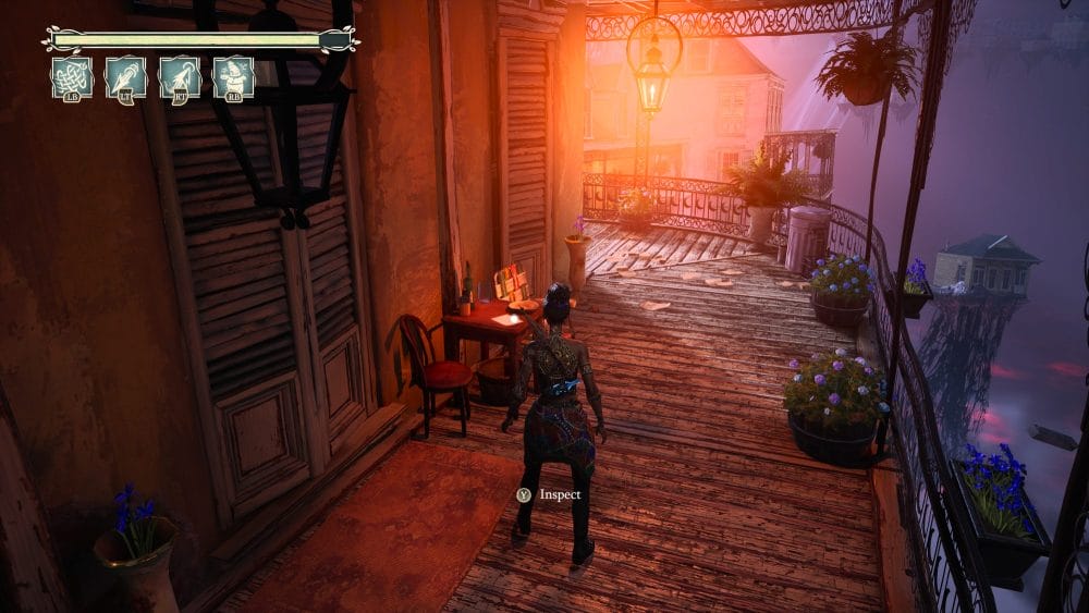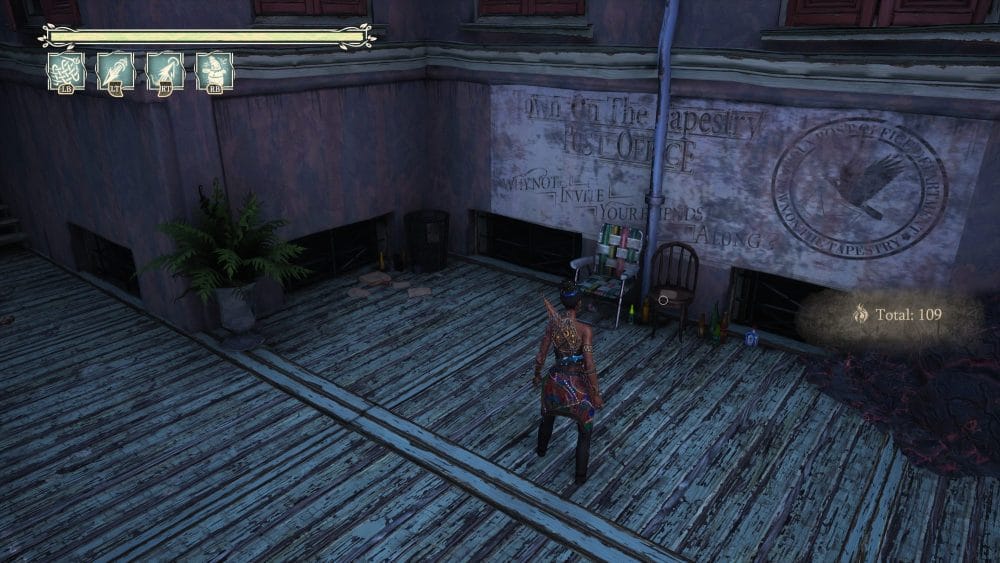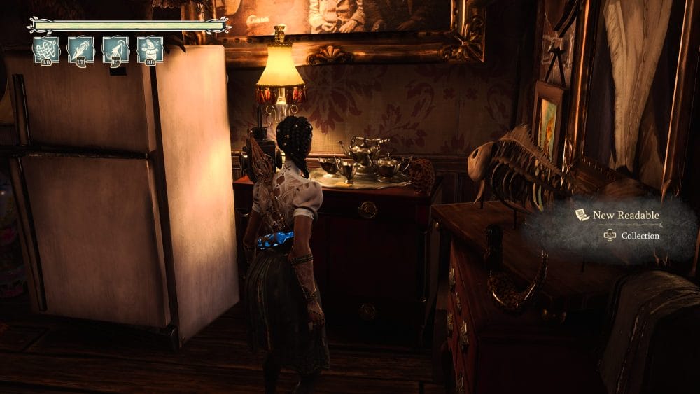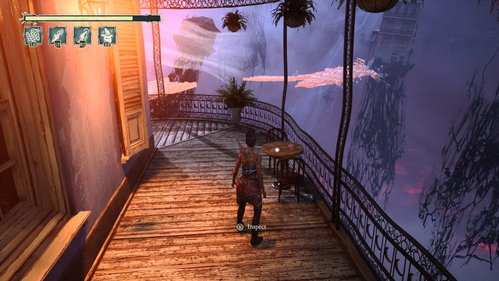 Turn around 180 degrees from the previous collectible and look down. You will see a ghost platform you need to activate. Do so and jump down. Once on it quickly look right and up into the little alley for a grapple. Grapple up to find a floof and in behind the floof is another note on the table.