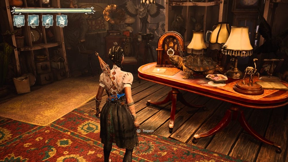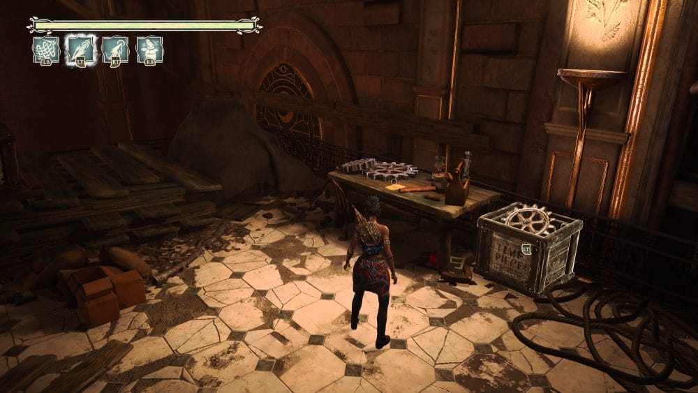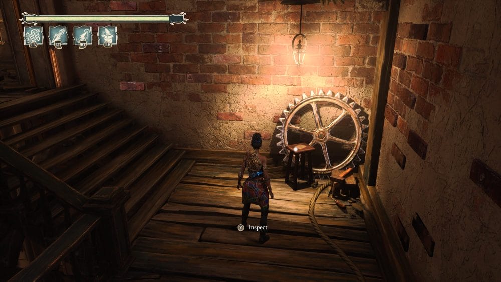 Progress until you get to the clock tower. Head inside the clock tower and activate the gears and go up the first one. Once you drop off the gear follow the path. You are going to need to throw a gear to progress but beside the box where you can get the gear is a note on a workbench.