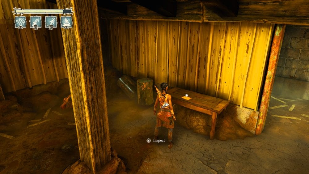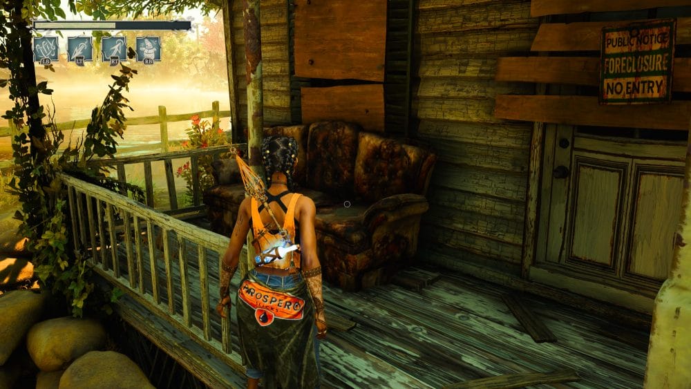 Reach the top, then jump over to the stack of hay and over the fence. Follow the path, then turn right to see a cabin. The Readable will be on the porch on a chair.