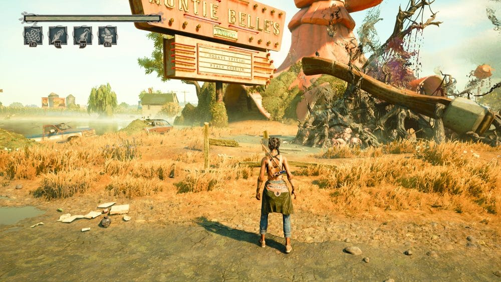 Continue until you reach a giant statue and a big sign that says "Auntie Belle's". Just before the sign, there is a piece of fence still standing. On the fence is a Readable.