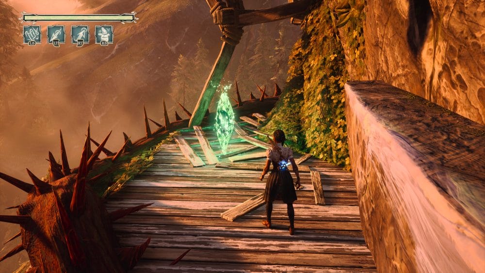 Once across you will see a ghostly cart and shed you can use your magic on. Do so, jump on top and quickly jump across to the silo where the health filament is on top of.