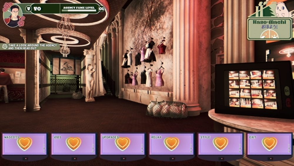When you arrive in Kaso-Machi, the cursed town, you arrive at a love hotel. Here we meet our partner in not so much crime, Pinky☆ who you recognize from the opening information scene. While you don't get the friendliest welcome at first, Pinky☆ will come around and before long, you are on the road to opening your shared mascot agency. Of course, it can't be under the name of a supposedly dead Yakuza so expect Pinky☆ to be the face while you're the brains behind the scenes.
