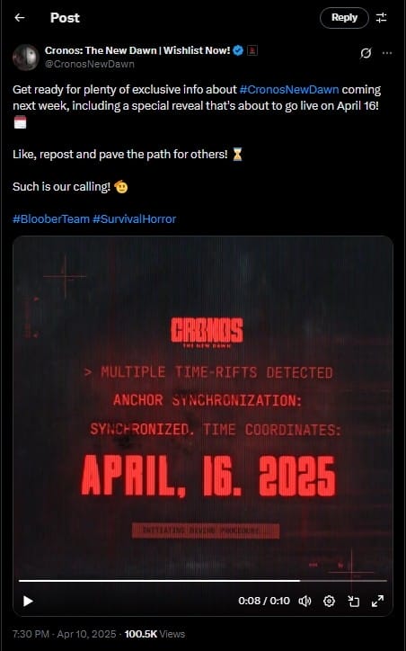 The message was accompanied by a short clip of digital red text on a black screen, ending with the date “April 16, 2025.” It’s not much to go on, but the text in the clip is likely alluding to elements of Cronos: The New Dawn’s world and gameplay, with mentions of “time rifts” and “anchor synchronization.”