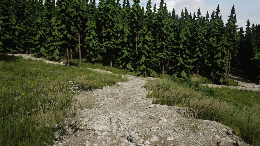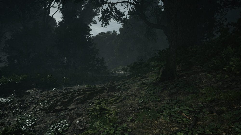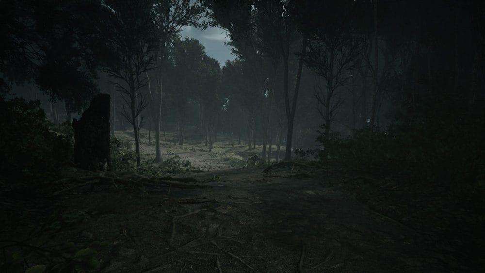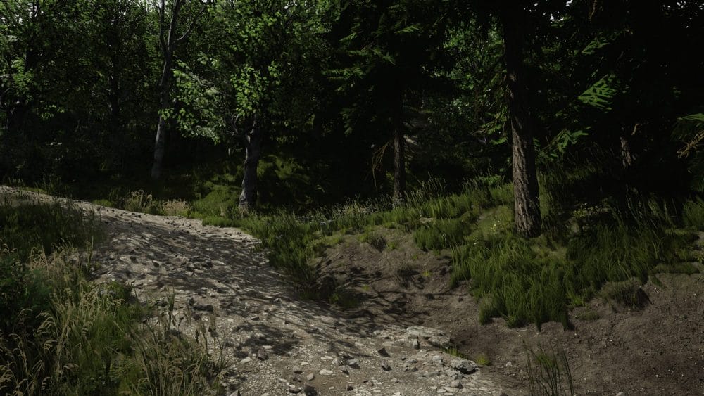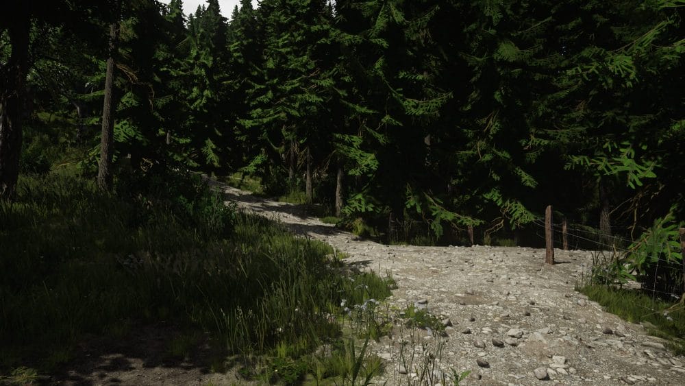 From here, turn left and head towards this path in the trees: