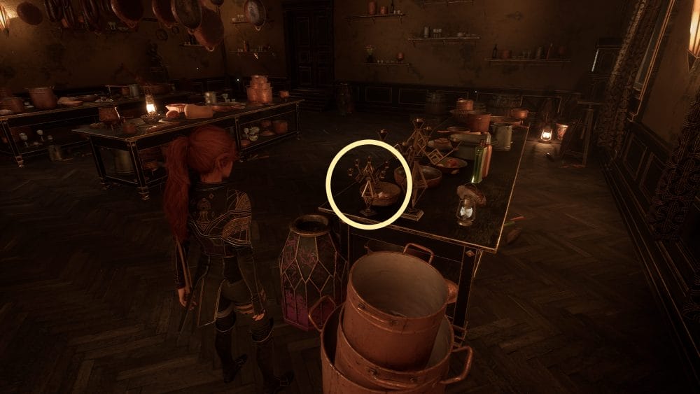 At the end of one of the tables are some candlesticks; interact with one to hear a mechanism rumble. That’s one down, two to go!