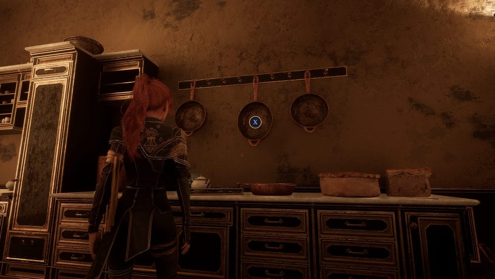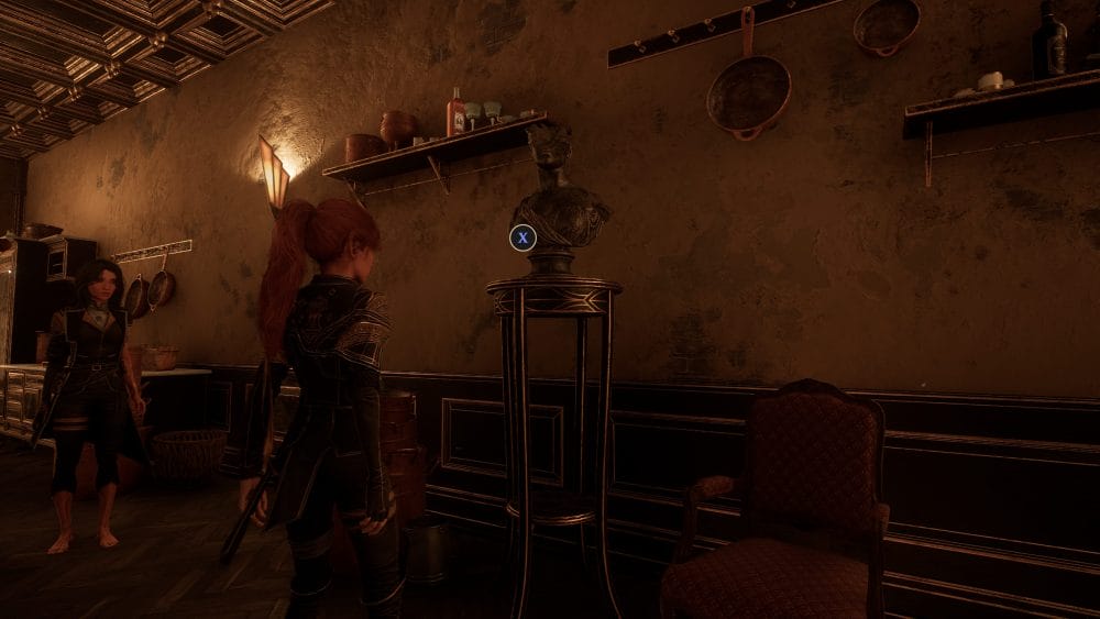 To the right of the pans near the door is a bust on a pedestal. Interact with it, and the door will be unlocked, letting you enter the rest of the Manor you have discovered.