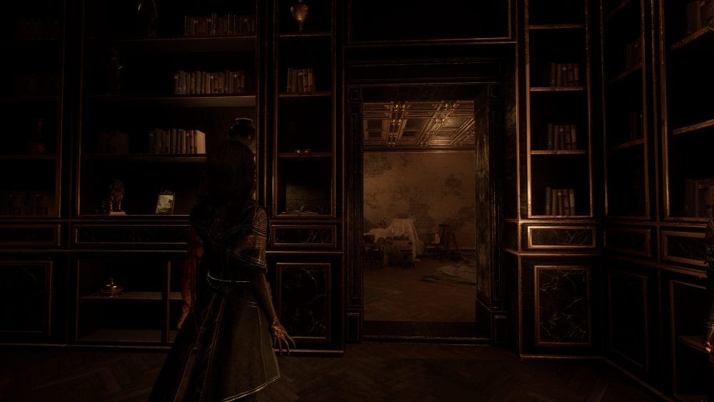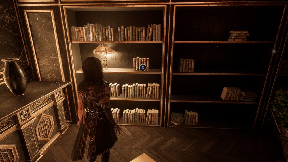 Get back to the balcony area and check the bookshelves for an interaction point and a secret door.