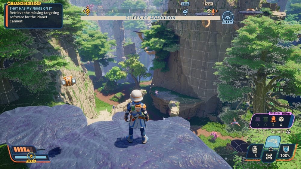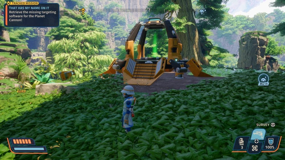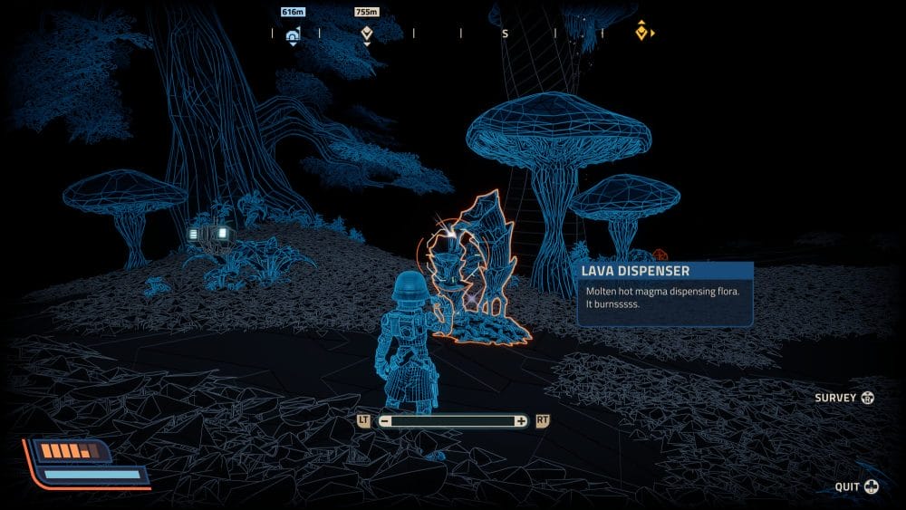 Using the survey button will help you highlight anything in your surrounding area that might be of interest, most notably, resources. Surveying will also help you keep track of where all your missions are on the map and help guide you. Additionally it will highlight any weaknesses on creatures if you’ve already scanned them (more on scanning later).