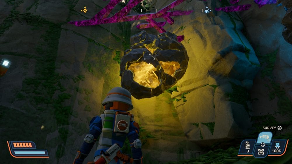 Perhaps the most important thing you will need to do in Revenge Of The Savage Planet is mine resources. Resources are vital to everything you will do and are required for upgrading and creating new equipment. The resources are found within large rocks scattered around the maps, and usually up against rockfaces.