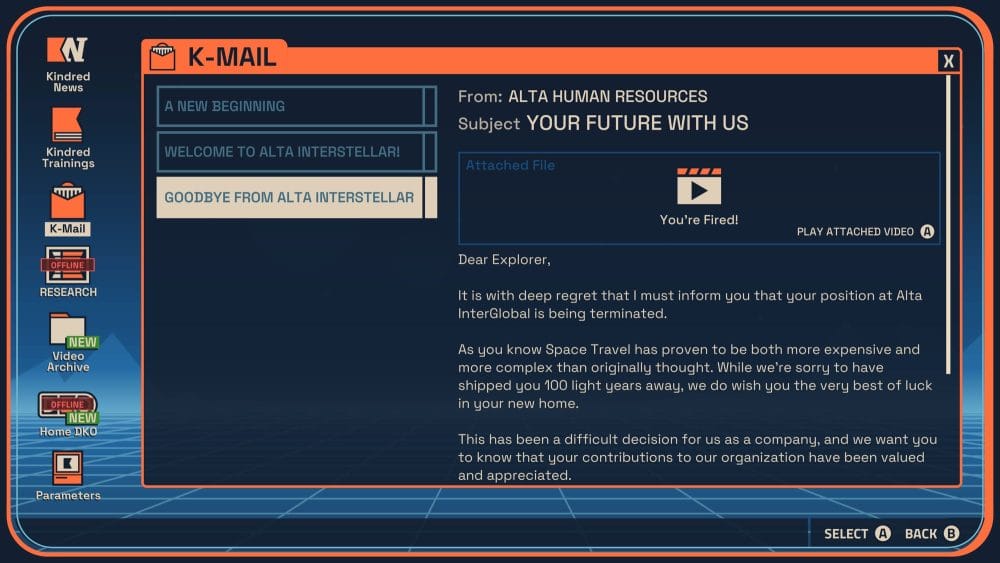 In order to unlock the You’re Fired achievement/trophy you will need to head to your Habitat’s computer. As you likely noticed there are many files within the computer. In the K-Mail folder there will be a few messages, one of which is to tell you that you’ve been fired! Just a terrible way to treat an employee you’ve sent to space if you ask me. Scroll down to the “Goodbye From Alta Interstellar†and you should unlock the achievement/trophy.