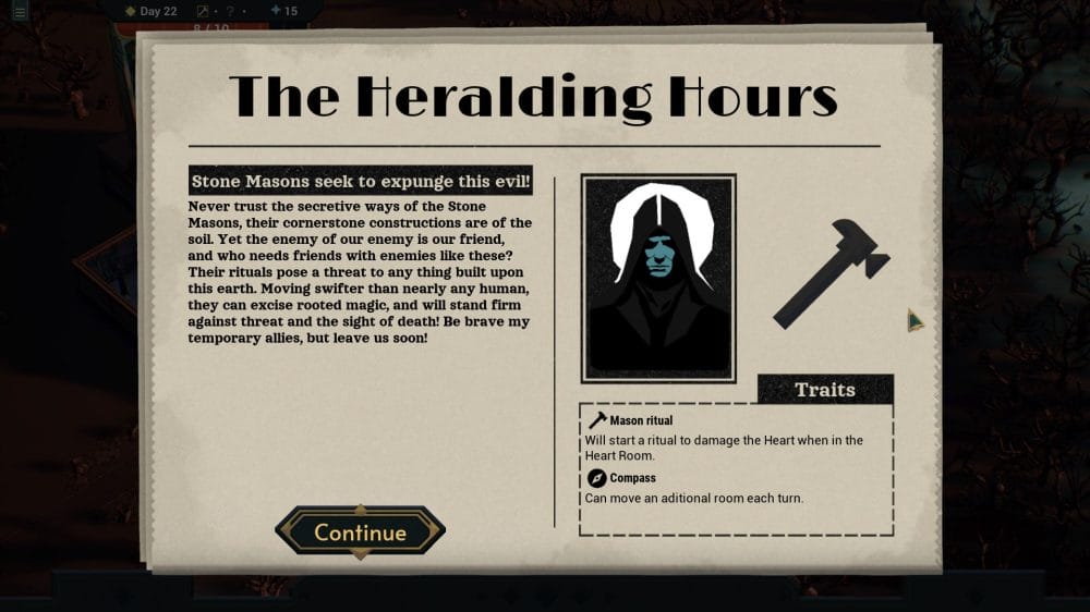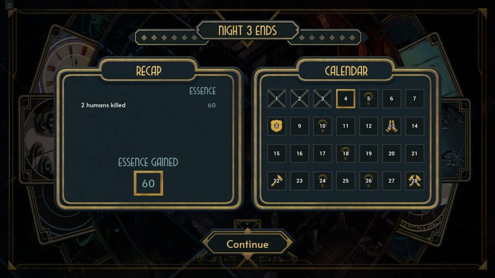 The difficulty spike with the final boss also somewhat feels like quite the jump. It could be that I did not have the best set of cards each time I went up against the final boss, but trying to take him out at times felt near impossible. After almost 19 hours, I could only take him out once with the perfect line up of the bell tower and the bell falling on him to take 100 damage. The increase feels like a lot from the second to last day to the last, but overall, there isn’t too much to complain about. Of course after the high of overcoming the Masons, what comes next?