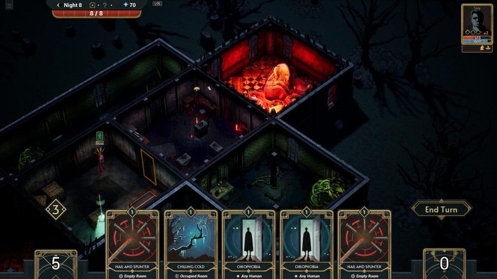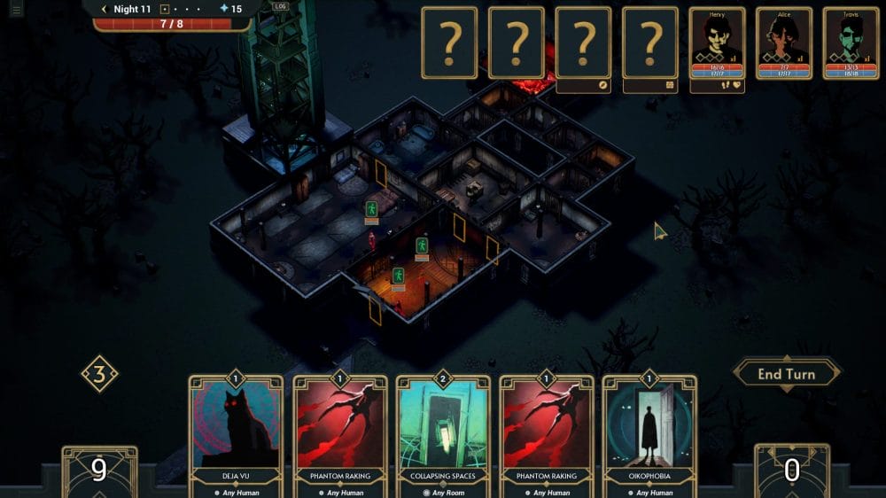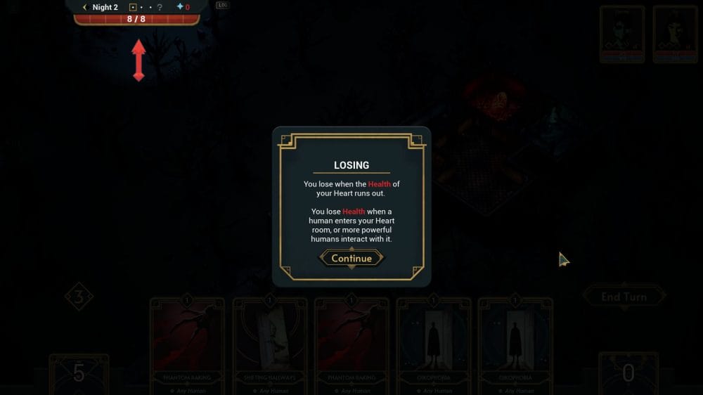 If they escape, you get nothing. If you kill them, you’ll earn 30 essence points. Driving them insane will only earn 25. If you can manage to drive someone insane while others are still alive, try to double your points by killing the insane person. Sometimes this is easier said than done, especially depending on which humans invade your home. The next morning, you’ll get the chance to add an additional card in your hand or get a room card to continue to upgrade your house. You can only choose one. You’ll then get the opportunity to change the layout of your house before night begins again.