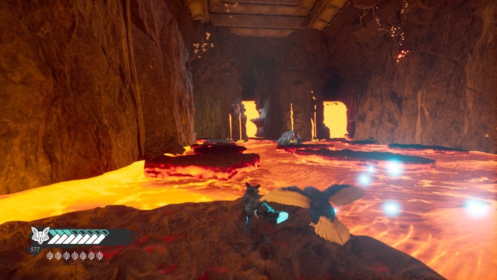 This boss is fairly simple. You won’t fight him directly. You’ve got to make your way up the river of lava. You’ll need to avoid the Bear who is trying to attack you throughout. There are three passage ways behind the Bear. You will need to head up each one and, using your Spirit Fox ability, activate the pillars at the end. Doing this three times will drain the lava and defeat the Bear.