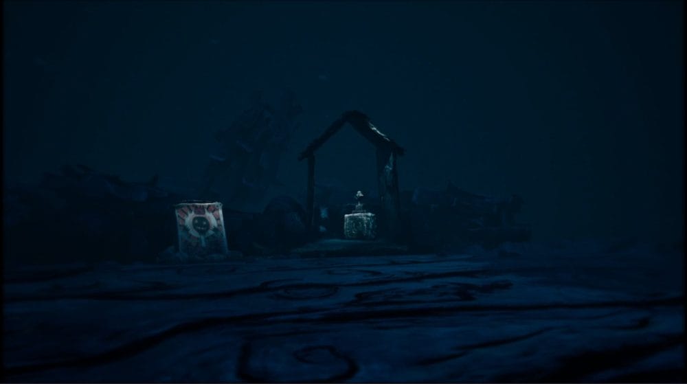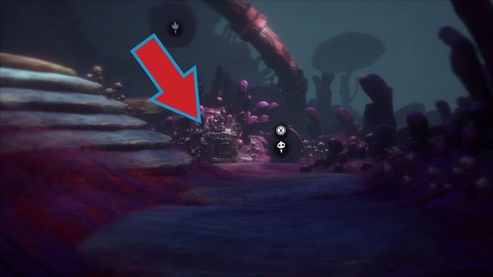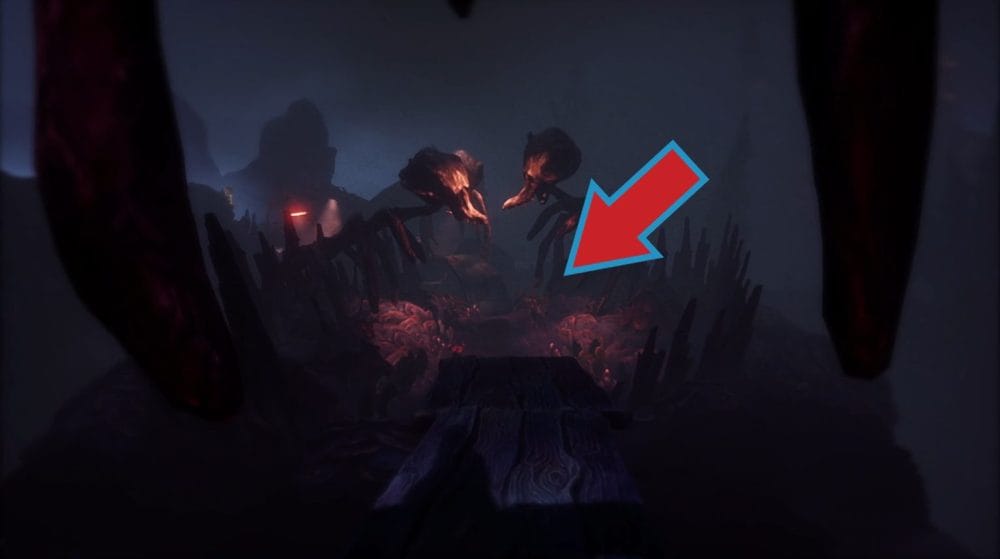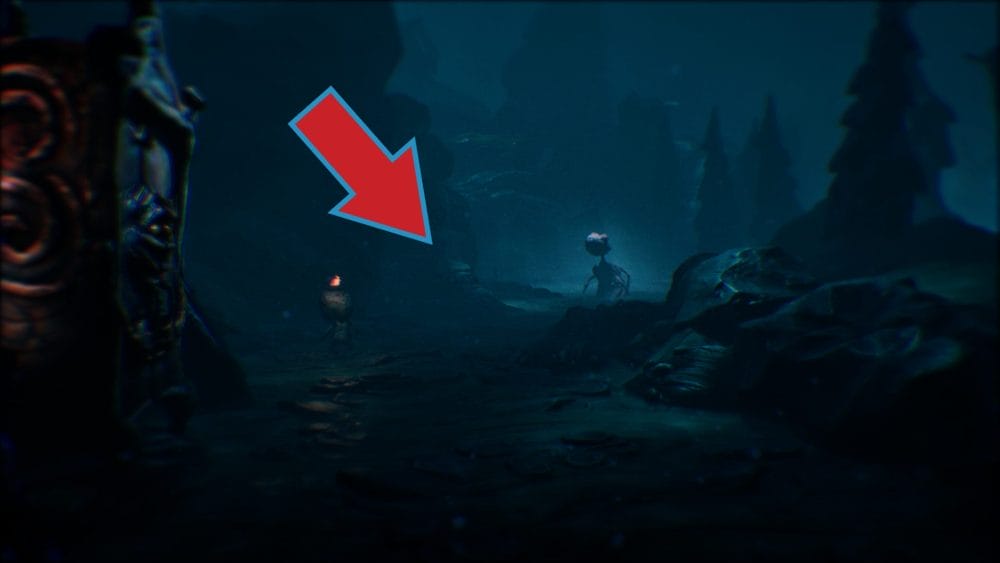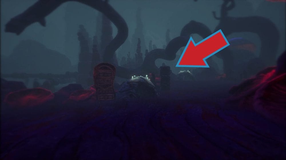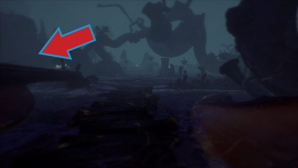 This next collectible is found in the middle of the swamp area, where you must avoid the Molgrim. There is a stack of boxes with a red door next to one of the burrows you hide in.