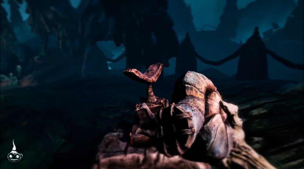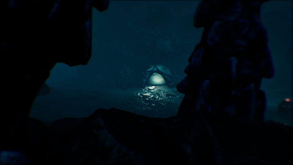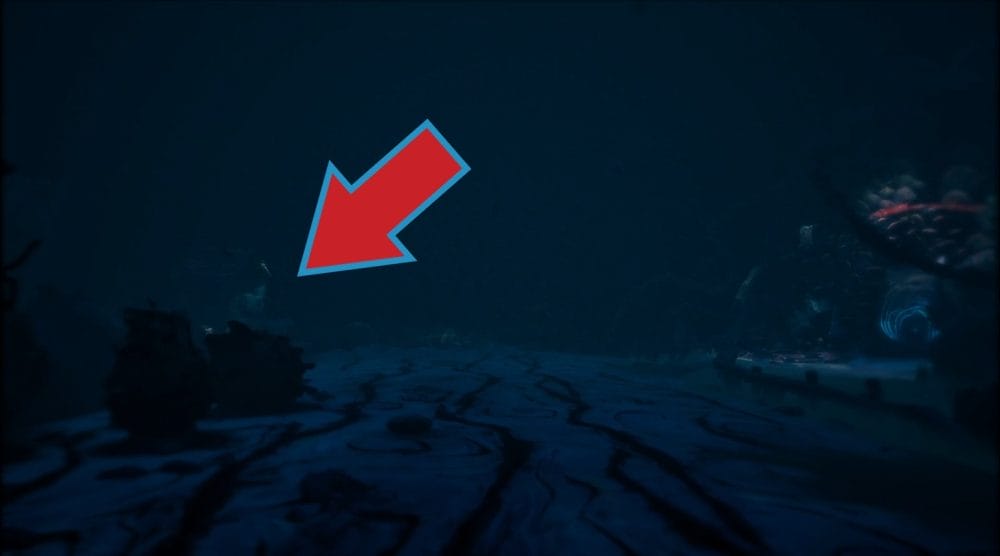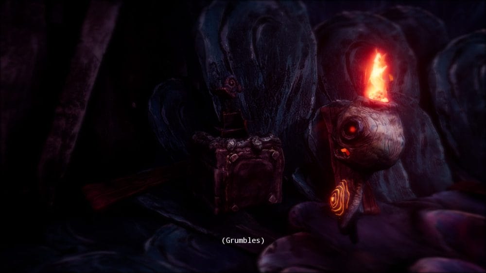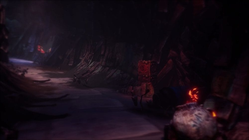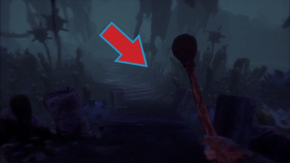 This next collectible is found in the middle of the swamp area, where you must avoid the Molgrim. There is a stack of boxes with a red door next to one of the burrows you hide in.