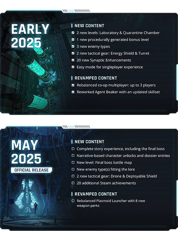 “A roguelite twin-stick shooter that can be played solo or in a group of up to 3 players (crossplay not supported). As an Agent of the S2P Corporation, it’s up to you to investigate a crisis at the most top-secret facility of a company whose whole thing is keeping secrets.