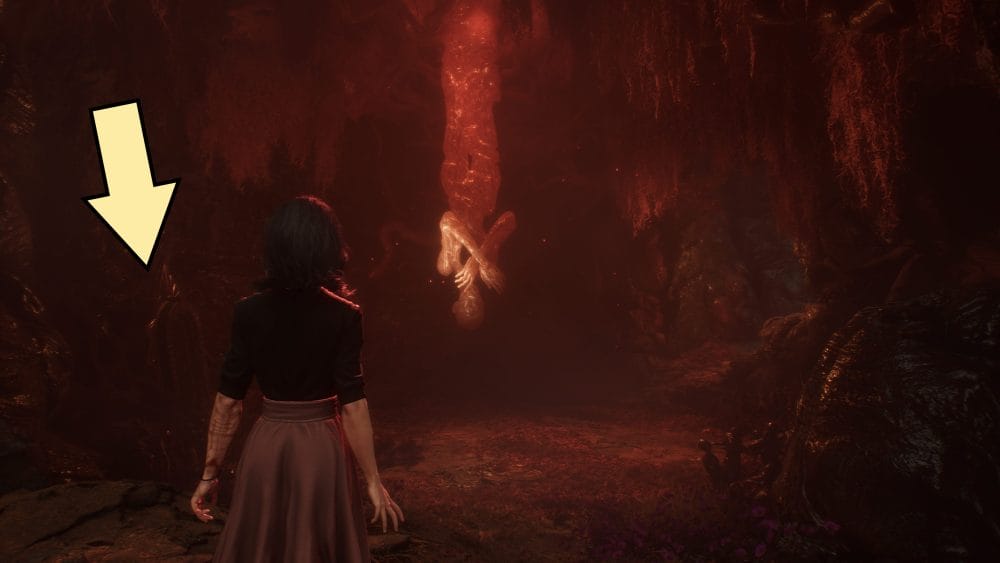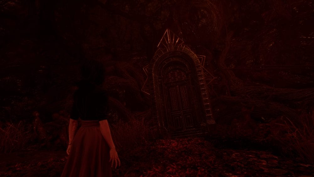 Don’t worry about the Lady of Sap hanging from the ceiling, she’s harmless. In the shadows to the left of her is the door to the Manor.
