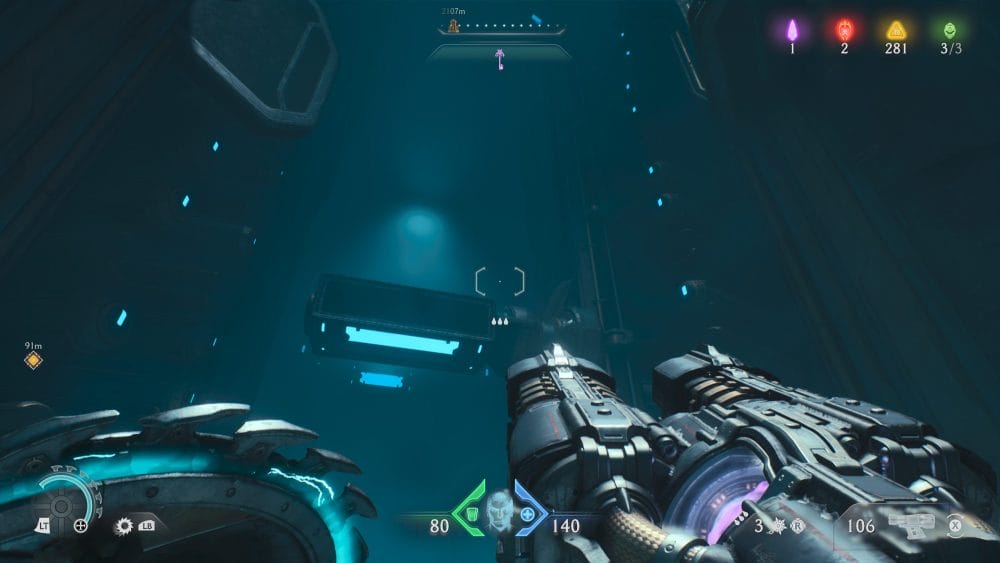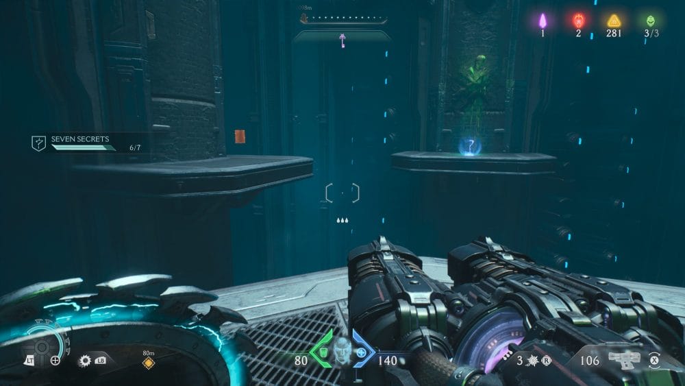 Continue until you flip the third and final switch for the forge. After flipping the switch head to the right where you will see an area you can jump across to with a locked purple gate. Go through the gate and follow the path here.