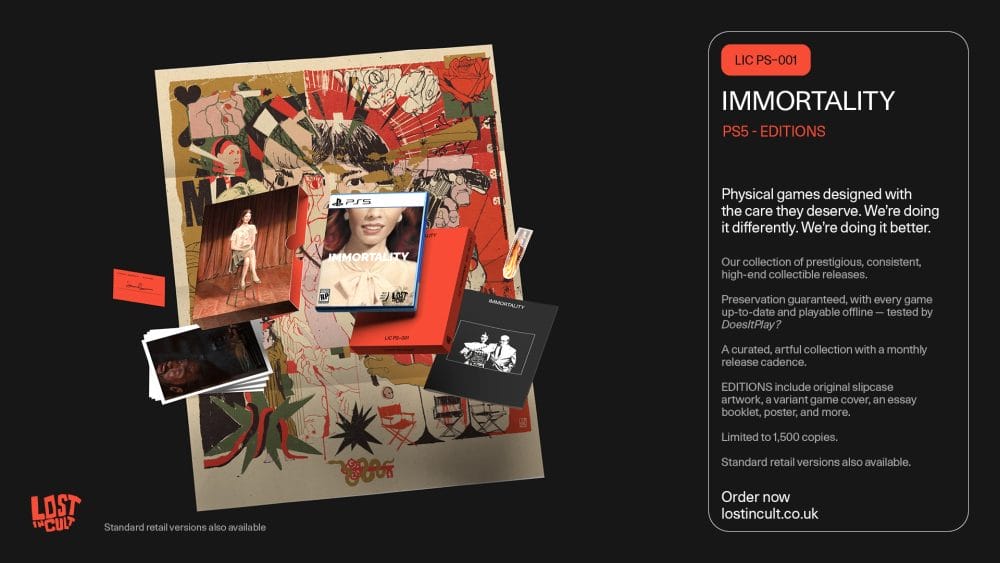 "Collaborating with Lost in Cult has been nothing short of a delight "” their attention to detail and their drive to keep adding more and more to everything they put out is evident in the quality of what they release," says IMMORTALITY developer Sam Barlow. "Each new treasure they create feels like a genuine companion piece, not just a "˜nice to have.' The most common request we've had since releasing IMMORTALITY has been for a physical edition, but we always knew that if we did do it, we'd need to do it right "” and so, working with Lost in Cult on this amazing new series was a no brainer!"