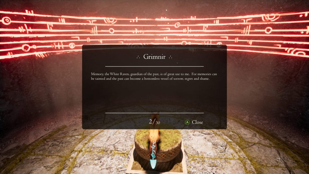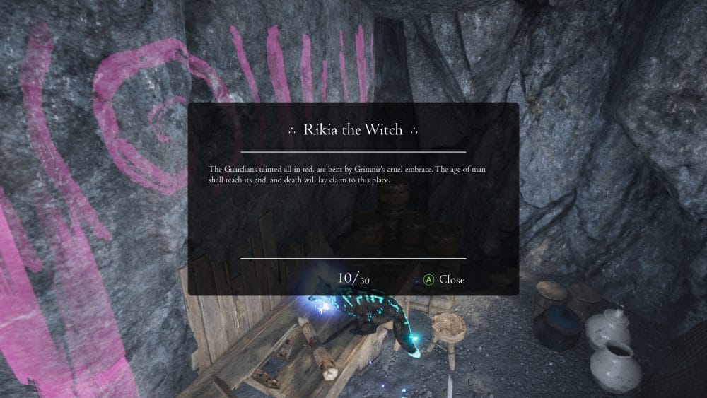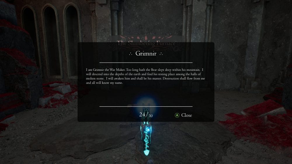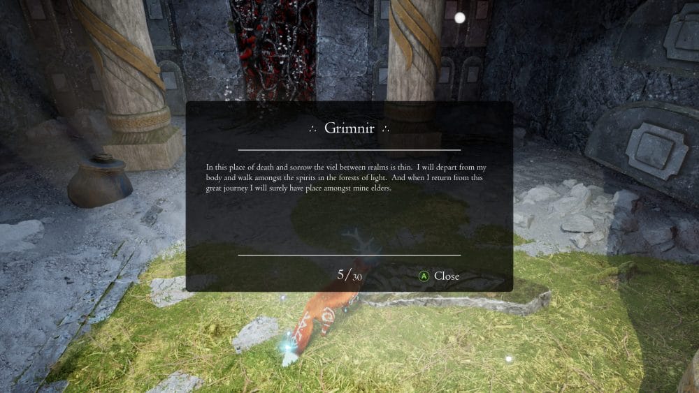 Following on from the previous collectible, drop down to the next level using the big hole in the centre of the room. There’s a scroll sitting in a side section of the room you fall into. There’s a big red rune on the wall behind the scroll.