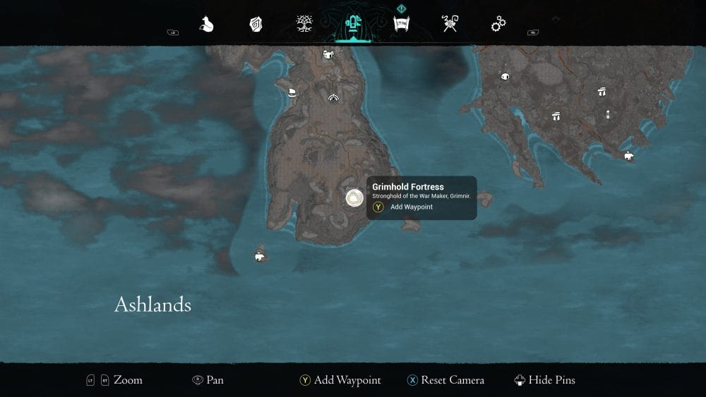Grimhold Fortress is at the bottom of the left hand island in Ashlands. At the very top of the largest structure. Would recommend using your Lore Seeker Rune, as I kept missing this one.