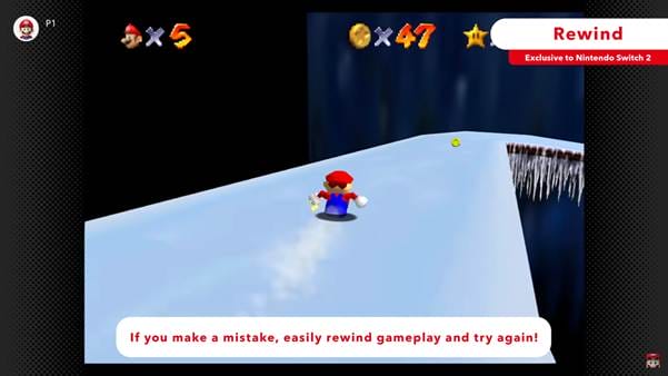 Adapting to older titles can be frustrating experience for new and returning players. Whether it's a sharp turn sliding down an ice slope on Mario 64, missing a putt in Mario Golf or re-rolling a dice in Mario Party (you cheat!), Switch 2 will offer a new rewind feature allowing players to roll back to where they need to.