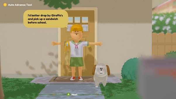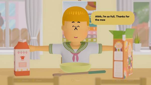 After speaking to your mom, you will want to head to the breakfast table and get munching on your cereal. Finish the bowl, skip the dialogue, then head straight towards the front door.