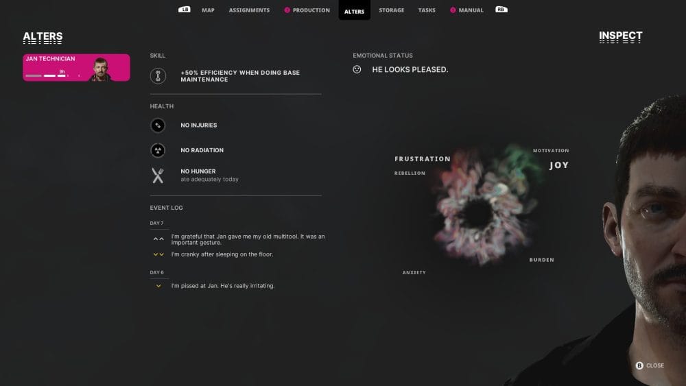 I won’t spoil the story here The Alters is one of those games that sneaks up on you with an intriguing concept and then pulls you deep into its world before you even realise what’s happening. It’s a sci-fi narrative adventure with a twist that makes it stand out from the usual fare – it’s all about choices, identity, and the consequences of the paths we take. Sure there’s a fair dose of sci-fi tropes to be had (conspiracy, shady corporations, etc) but the relationships Jan has to build and maintain with himself, but not really, was the lynchpin that held everything together.
