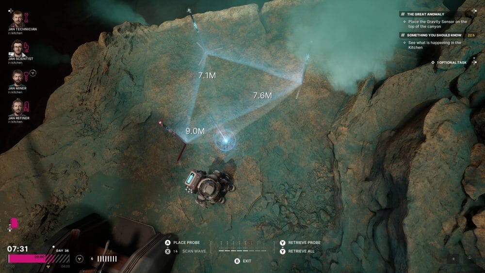Once you’ve located a resource, use your polygonal scanner to find the mining point. You can use a scan wave to see the direction of the deposit after placing down 3 probes. This uses a battery charge from your suit, but it is quite useful for speeding up the process.