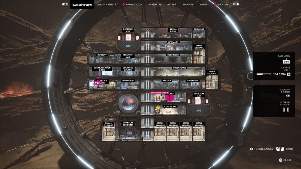 There’s also a system to keep on top of consumables. You can set specific items to have a production uphold, meaning that there’s an automatic task generated to manufacture a certain amount of an item. For example, you need at minimum one Radiation Filter per day. Setting up a Production Uphold of three means that whenever you have less than three, one automatically gets added to the production schedule in the Workshop. Whenever you or an alter uses the workshop, they’ll manufacture however many are needed to ensure the stock is back at maximum.