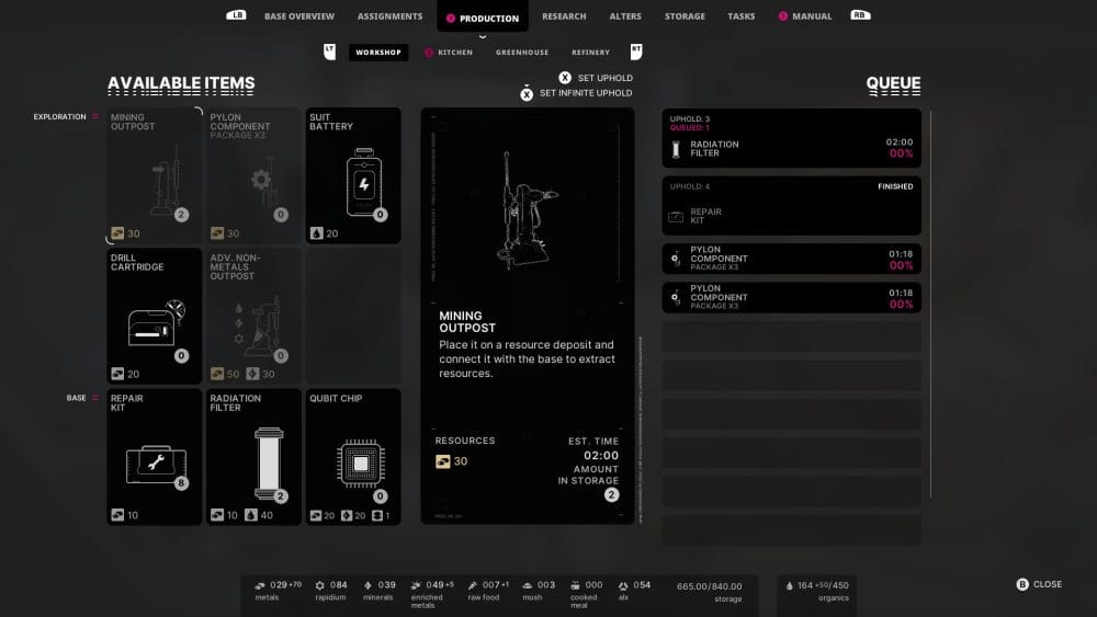 First off, The Alters is a survival game, and with that comes resources you need to mine and manage. You can find some surface-level deposits in the overworld that you can mine by hand, but in order to actually get anything done, you’ll need some mining outposts.