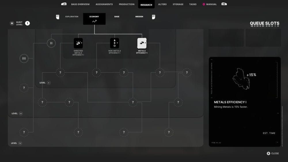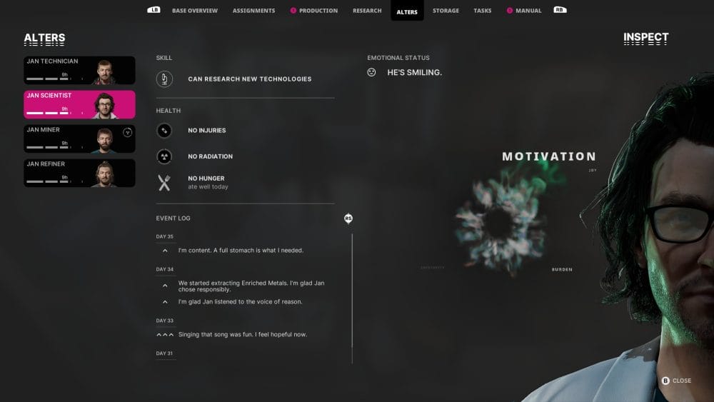 Each of your alters comes with a specific skill set, some of which are much more important to progression than the others. After branching into the mandatory Technician alter first, we’d recommend picking the Scientist alter. As mentioned in the resource management section, some resources can only be unlocked by using researched equipment, and the scientist is the only alter that can use the Research Lab to unlock upgrades. Prioritise resource mining upgrades and the base expansions asap, as it makes managing and storing enough resources a lot easier.