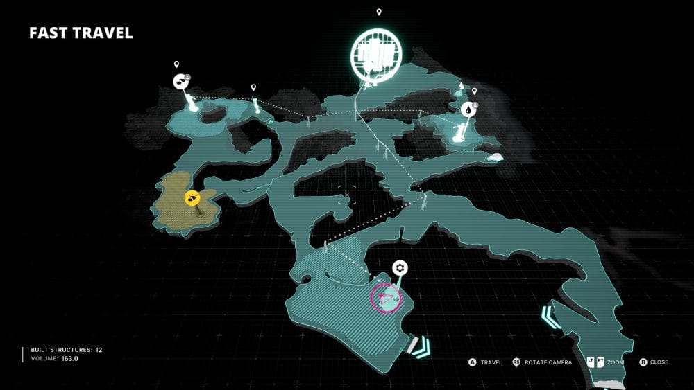 When placing pylons, you’ll want to set them up so that other resources can utilise the same ones. There’s no limit to the amount of resources running down a specific line, so having a central pylon near your base that you can run multiple resources through is ideal. Later, you’ll also unlock fast travel pylons, which can be placed in the centre of an area to make further exploration easier.