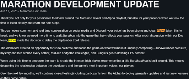 In a statement, Bungie said they "need more time to craft Marathon into the game that truly reflects your passion". They are taking on feedback from Alpha playtesters and the wider community to "empower the team to create the intense, high-stakes experience that a title like Marathon is built around".