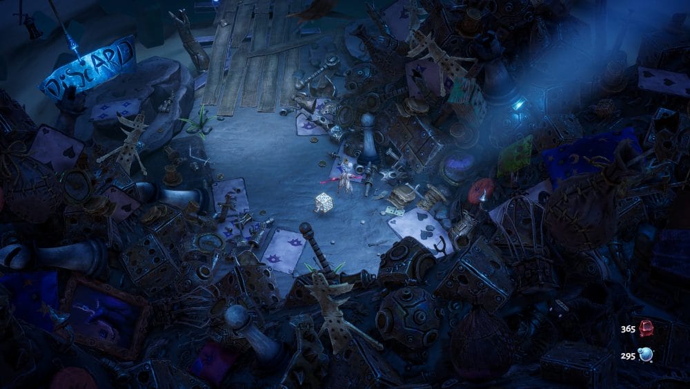 The Eternal Die does away with the stop motion animation of its predecessor, choosing a smoother style, which certainly lends itself to the frenzied flow of combat. I think it is a shame that we have lost some of that handcrafted feel that the first game had, but I can’t deny that The Eternal Die looks gorgeous. All the environments are packed with details, from moss-covered flagstone paths through swampland to Sanctuary’s cluttered existence, a trash heap of random stuff from Random, complete with a large “DISCARD” sign upon returning.