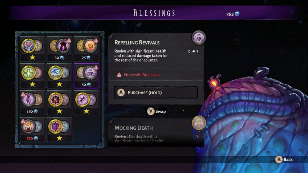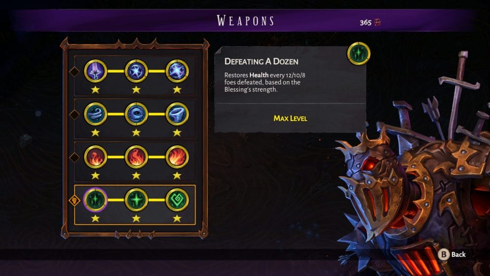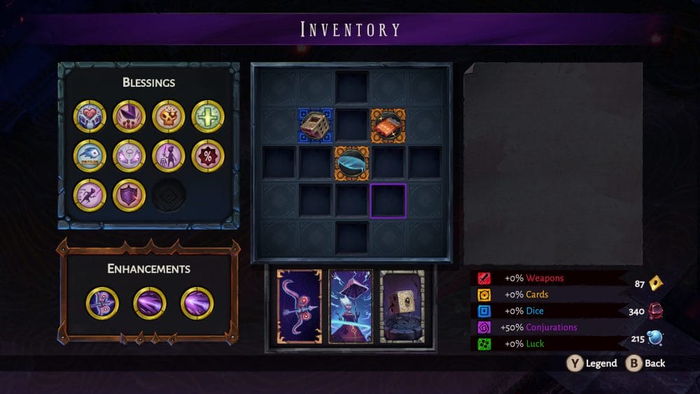 Like any good roguelite, The Eternal Die has its mixture of temporary upgrades, which you build up during a run and then lose when it is over, and permanent upgrades to strengthen you on your next run. Permanent upgrades come in two ways: upgrading Aleksandra’s weapons and Aama’s Blessings. Weapons are upgraded by talking to the dilapidated and delightful pawn, Rack, with each weapon having four different sets of buffs, which you can equip one of for your runs in the Black Die. There are three buffs to each set, and they follow a theme, like better healing or applying certain status effects, with some buffs having several levels. Cinder is the currency used to unlock and upgrade your weapons, and is earned as a reward for completing a room.