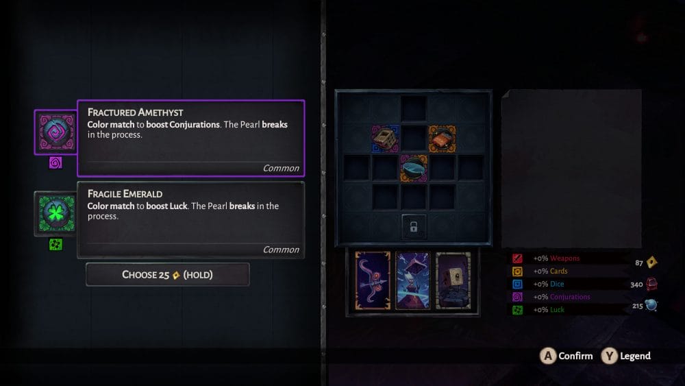 The other items you find that can be placed on this upgrade grid are pearls, which are used to fill an unused space but provide no effects. These pearls are used for the second function of the board, which is to line up three or more relics and pearls of matching colour to gain a boost to the linked stat. Each relic or pearl can have one or more colours, so thinking about what effects and stat boosts you want and looking ahead can be crucial to a successful run. It took me a few runs to get to grips with this system, but once I understood how to gain stat boosts and pay attention to which relics did what, I was able to start planning and adjusting mid-run. I can imagine players developing some pretty devastating builds if luck is in their favour.