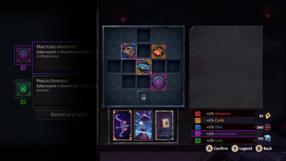 On the temporary, mid-run side of progression, The Eternal Die has a fun, boardgame-like system that offers more depth than its design belies. During your runs, you will pick up relics that grant magical effects and passives to help you on your quest. These relics are equipped on a grid board in the shape of a diamond, with only the centre square available to start. Once the first relic is slotted in the centre square, the neighboring squares become usable. There are dozens of different relics to equip, with a plethora of effects that can be applied to either Aleksandra or Fortune, and can really change up how you play on a particular run.