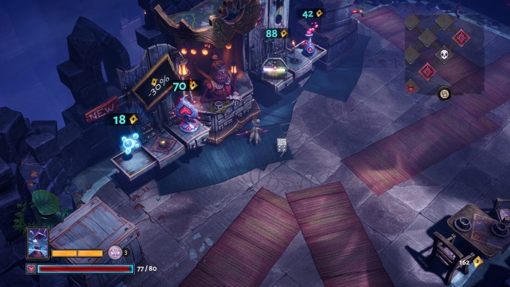 Lost In Random: The Eternal Die is an isometric action roguelite, composed of runs through procedurally generated levels which are separated by floors. Levels are comprised of rooms connected by corridors, allowing players to backtrack and continue exploring or revisit Mannie Chex’s shop. You must complete a room before progressing to the next, and are rewarded with buffs, healing, or currencies at the end of each room. There are a total of four floors to overcome in order to confront Mare the Knight, and with no option to skip floors you have previously beaten, you must complete a full run and defeat Mare to earn your freedom. (You can fast travel between important rooms on each floor, but not between floors.)