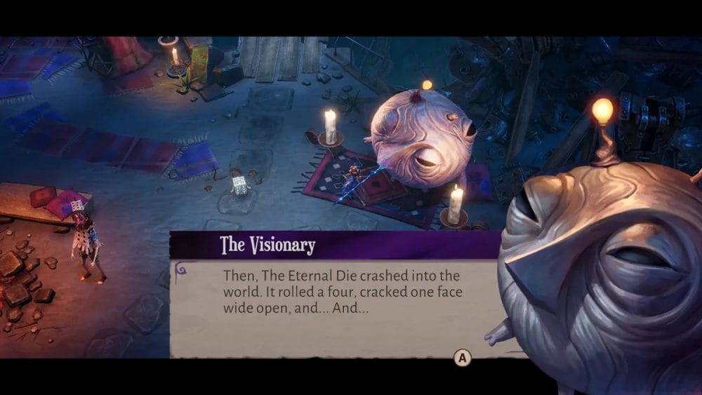 As opposed to weaving a narrative as you progress through the game, The Eternal Die explores Queen Aleksandra’s backstory and deepens the lore and history of the world of Random. Most of this is delivered through fully voiced conversations with a wacky cast of NPCs, who congregate in Sanctuary as our heroes find them during runs in the Black Die. I particularly enjoyed talking with the bulbous, floating Visionary, who would regale Aleksandra with stories of Random’s origins, much like a creation myth, when she returned each of his memories to him. Most conversations are meant to give the player greater insight into the Queen, presenting her with opportunities to reflect on her behaviour as a monarch, before being trapped in the Black Die. However, it never really seems to take shape, and I felt her temperament and worldview stayed the same from beginning to end.