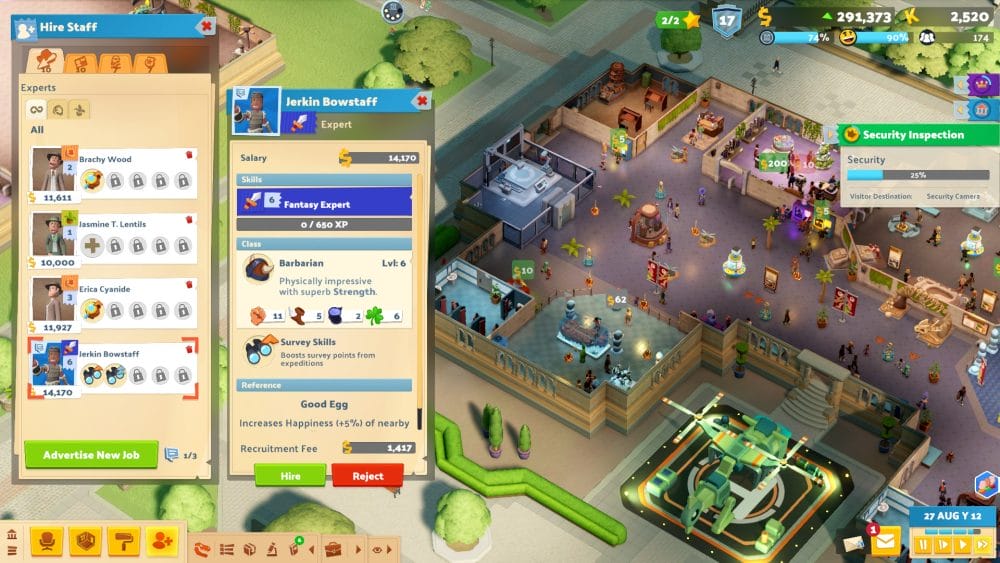 It introduces a new set of experts, Fantasy Experts. Unlike the experts for the other areas (Prehistoric, Botany, etc) these guys have subclasses; Barbarian, Wizard, Rogue or Bard. Do you see where this is going? Yep – you’re very own D&D adventure inside Two Point Museum. Like the other experts they’ll restore any Fantasy Exhibits you find, analyse excess ones to increase your knowledge and can give tours of your Three-Handed Swords and Hanging Tapestries. Unlike your other experts, when they level up they’ll gain stats – Strength, Dex, Int and Luck. They’ll need to put those stats to the test in a lot of your excursions in order to find exhibits and tackle danger!