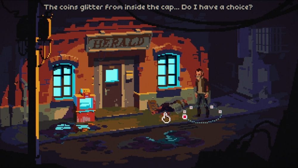 Head back out of the Mawson Herald and look at the newspaper box near the door. Next, interact with the sleeping homeless person and take the coins from their hat.