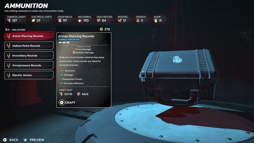 The catch with both crafting and upgrading is that you need specific parts to create the mods and to upgrade them. You gain those parts by playing missions and earning them naturally by killing Zeds, destroying security cameras and other means. You can see the full chart below explaining what each part is needed for and how to obtain them.